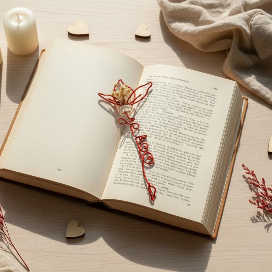 Coffret Cadeau “Je t’aime” – Porte-Clé en Macramé & Marque-Page Fleuri