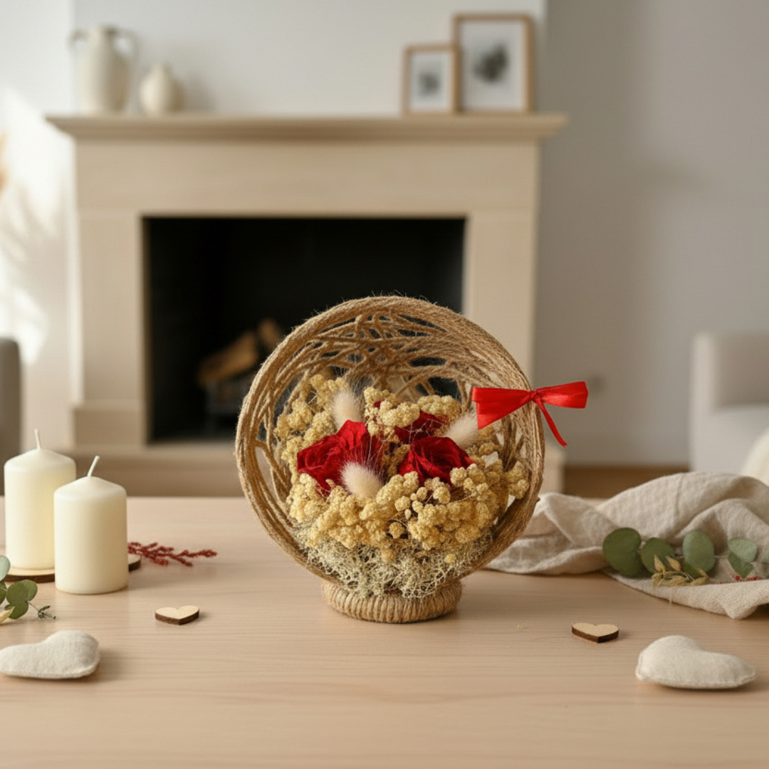 Composition Florale en Corde de Jute – Roses Éternelles & Fleurs Séchées