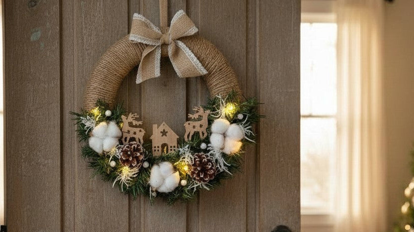 Couronne de Porte de Noël Lumineuse – Création Artisanale en Bois & Jute
