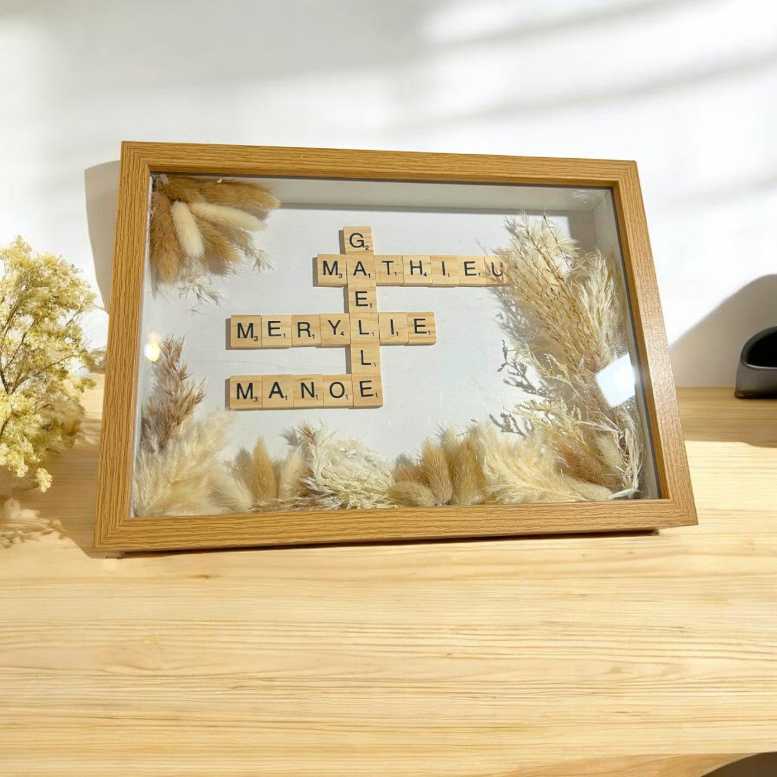 Cadre Scrabble Personnalisé Prénoms & Fleurs Séchées – Cadeau Unique pour les Mariés