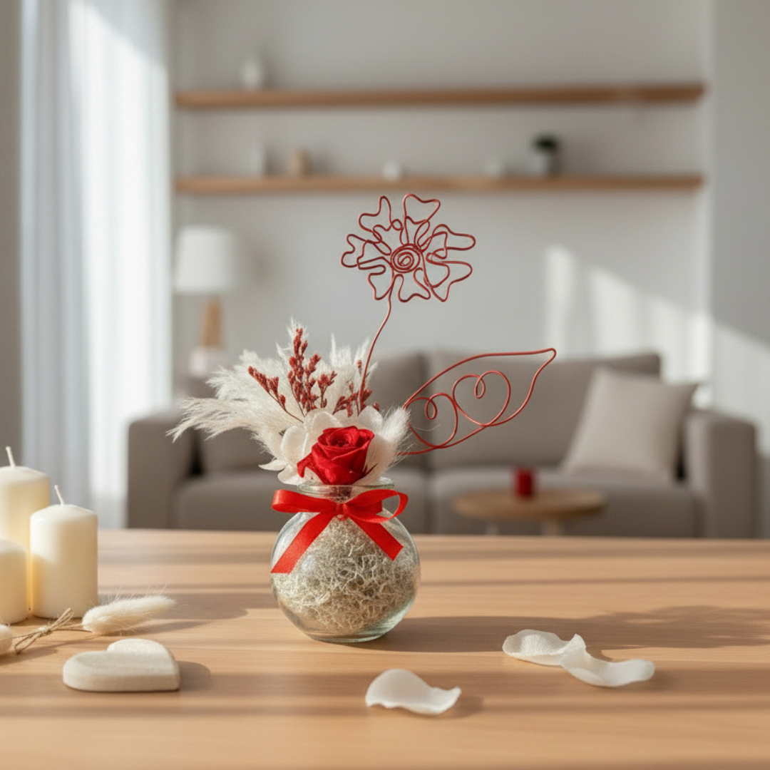 Vase Fleuri Personnalisé – Fleurs Séchées, Rose Éternelle & Fleur en Fil d’Aluminium