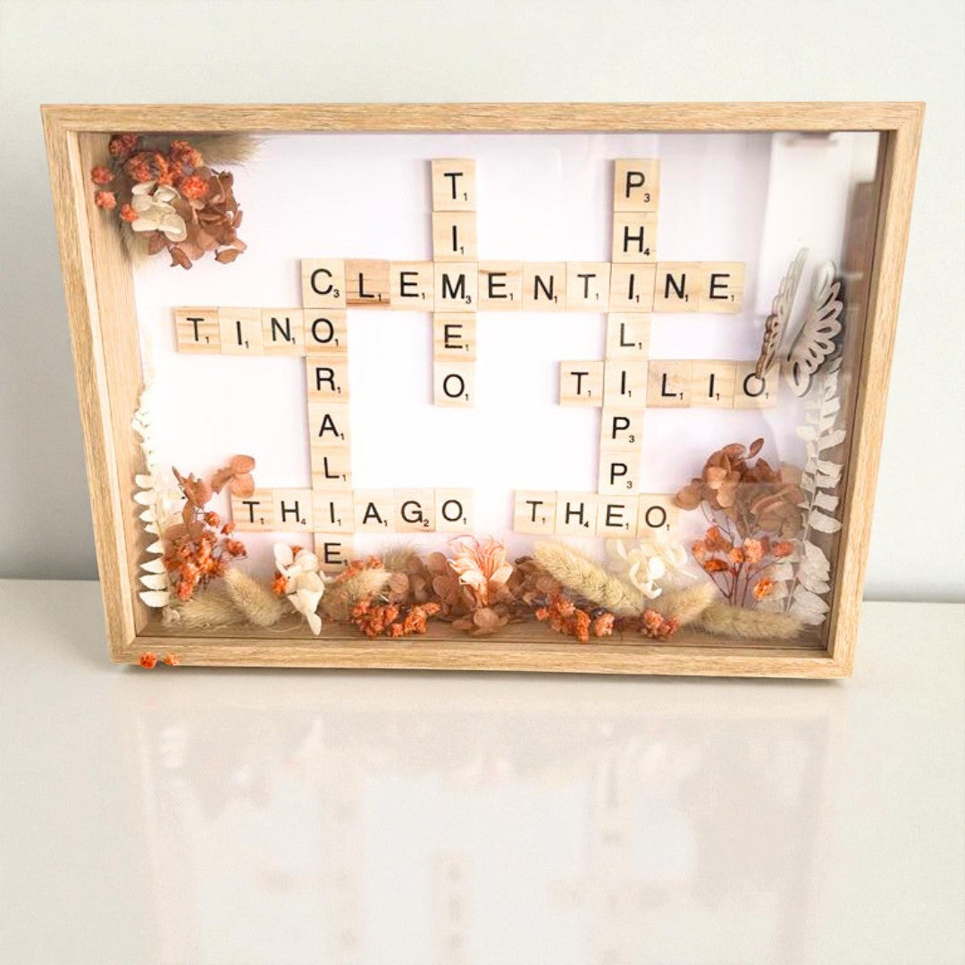 Cadre Scrabble Personnalisé Prénoms & Fleurs Séchées – Le Plaisir d’Offrir