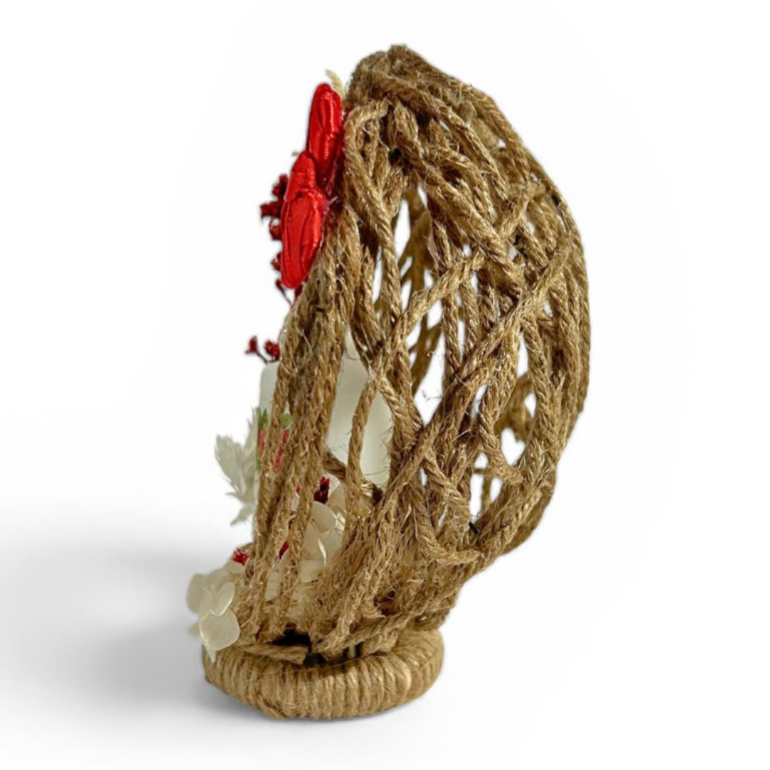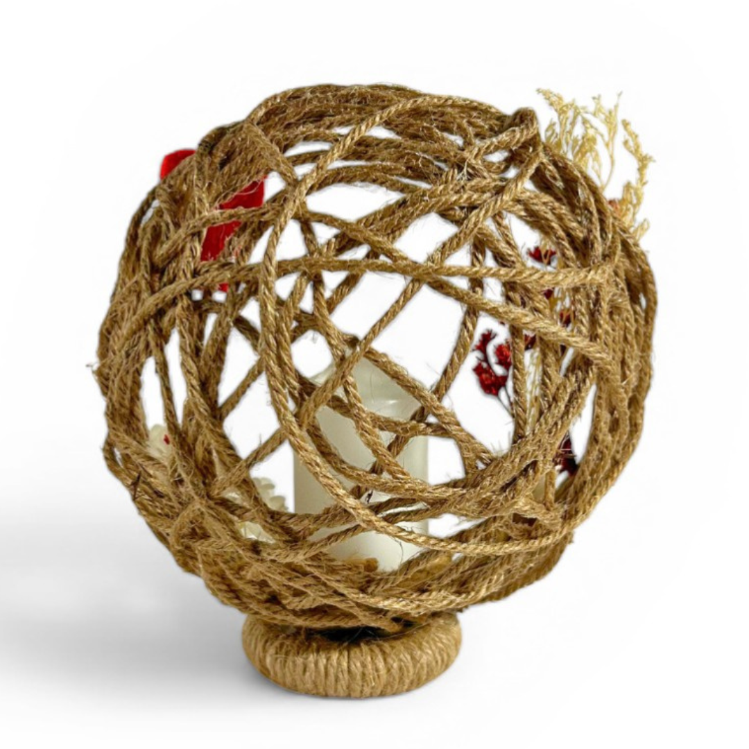 Apportez une touche de poésie et d’élégance au baptême de votre enfant avec cette composition florale artisanale. Réalisée en corde de jute naturelle, décorée de fleurs séchées délicates et de petits cœurs romantiques, elle accueille en son centre une bougie personnalisée (prénom, date, message).