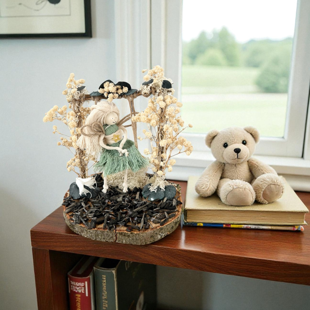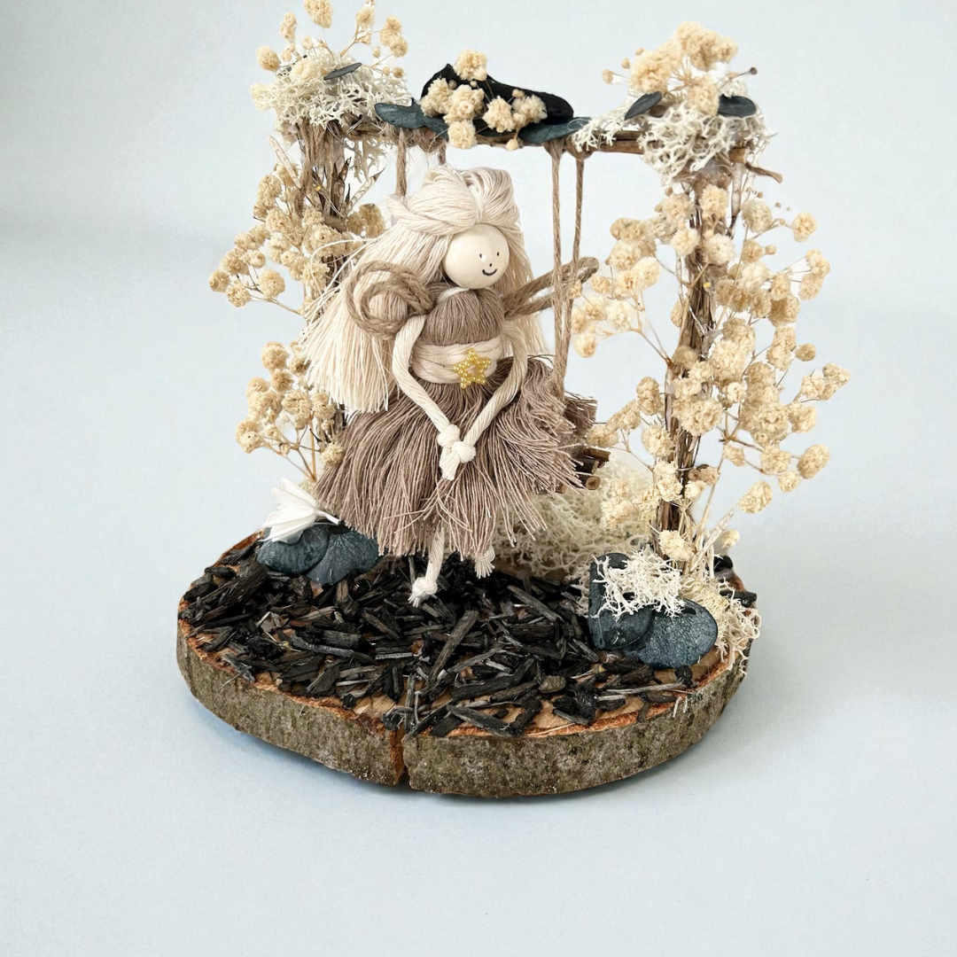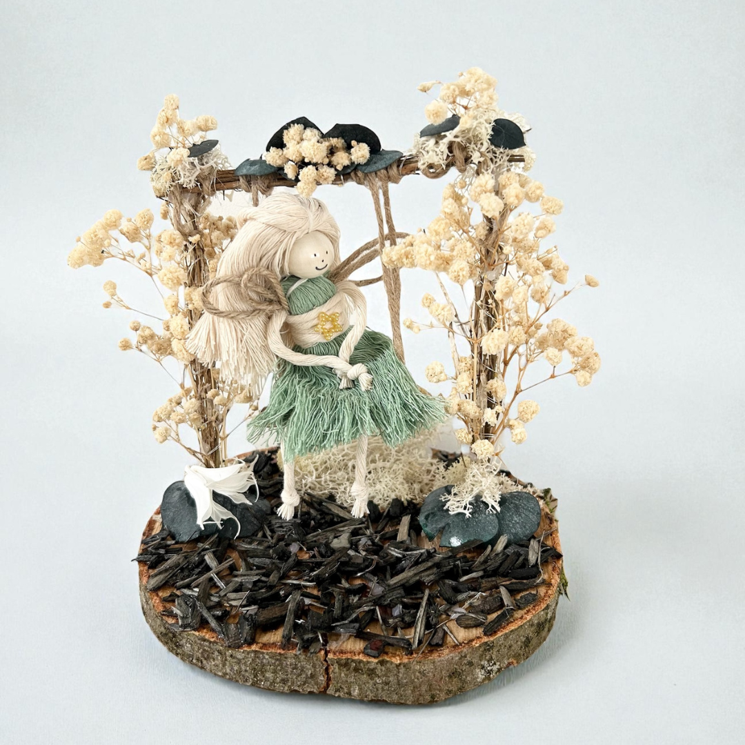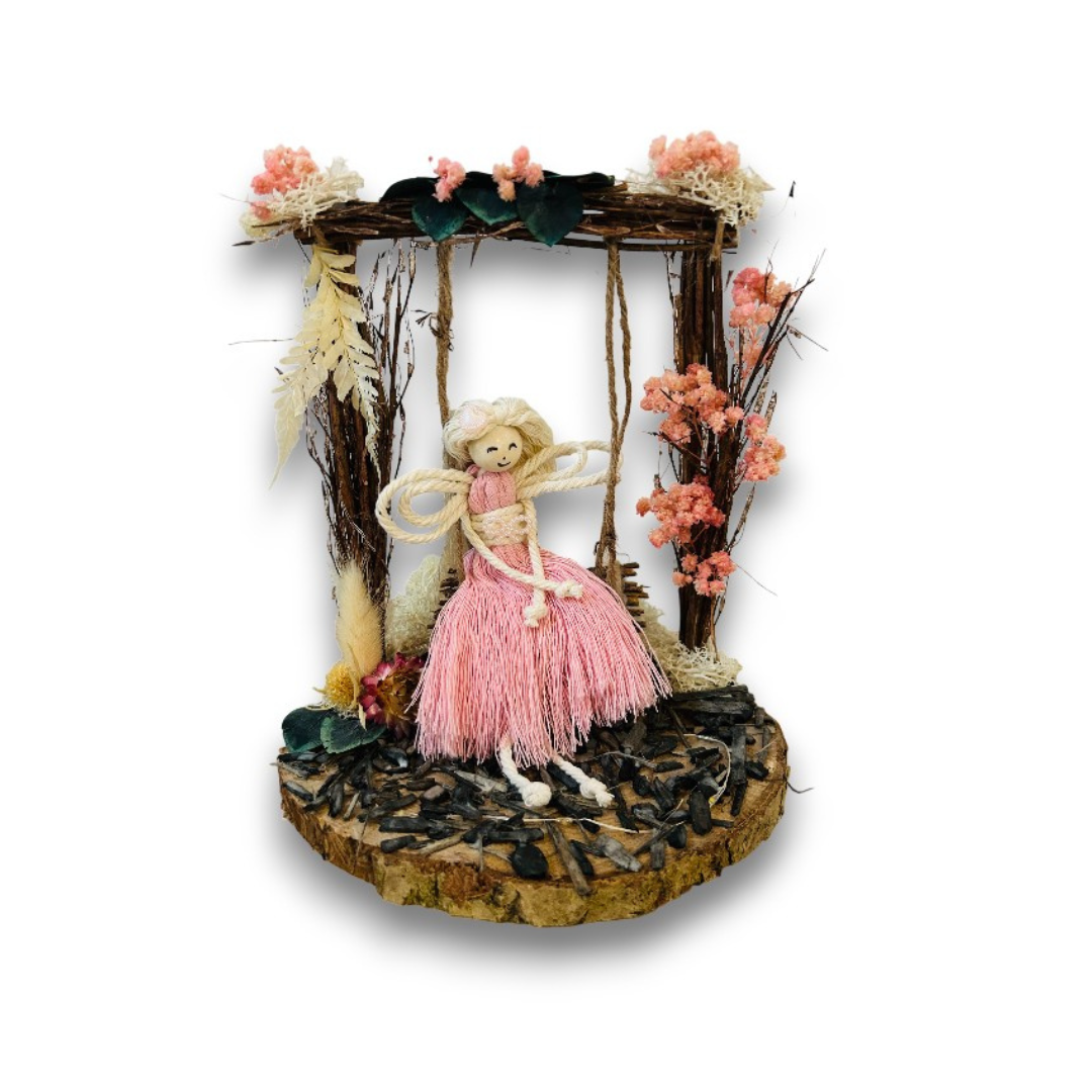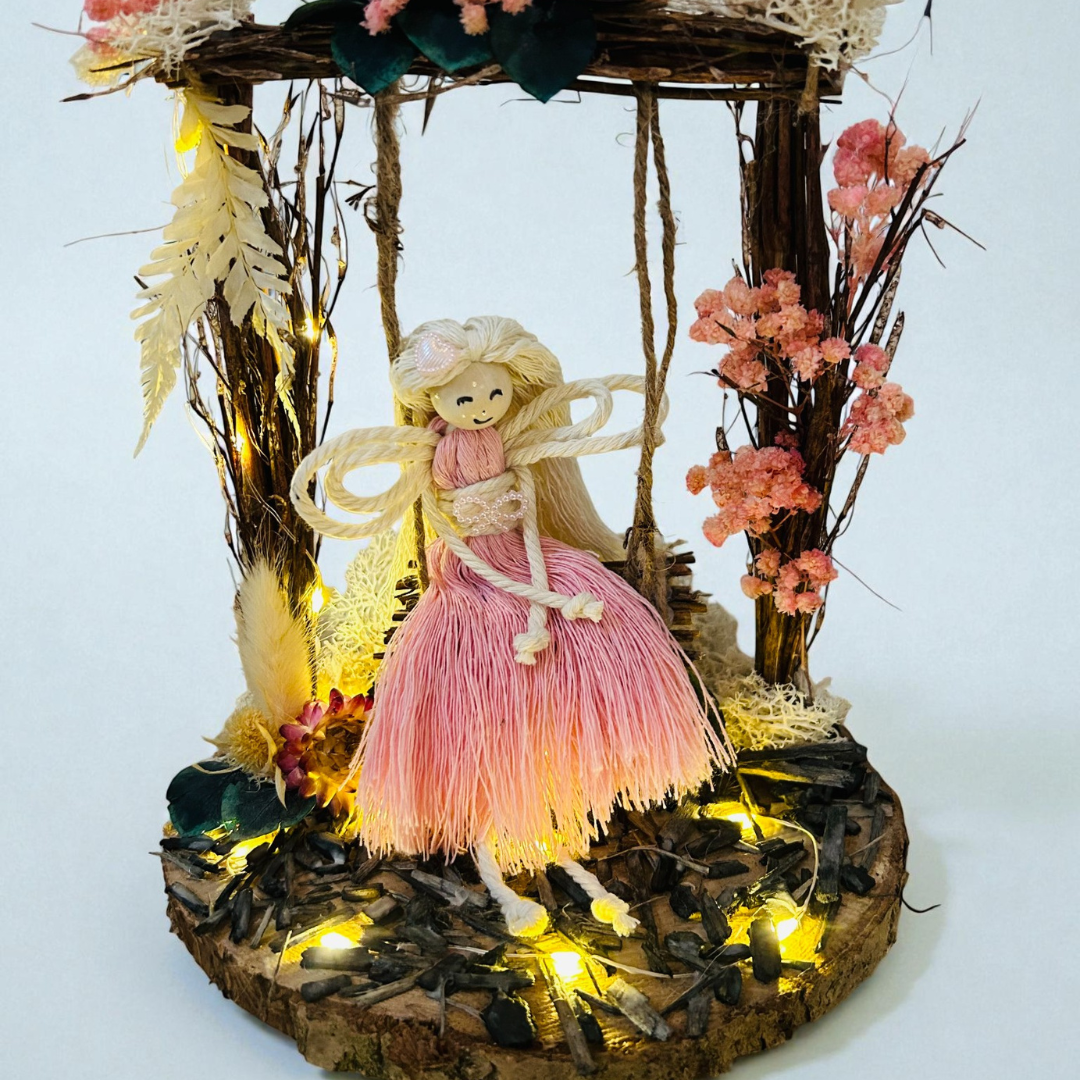 Faites plaisir à vos proches avec une création artisanale unique et féerique : une douce fée en macramé, assise sur sa balançoire, entourée de fleurs séchées naturelles et illuminée par une lumière LED chaleureuse.