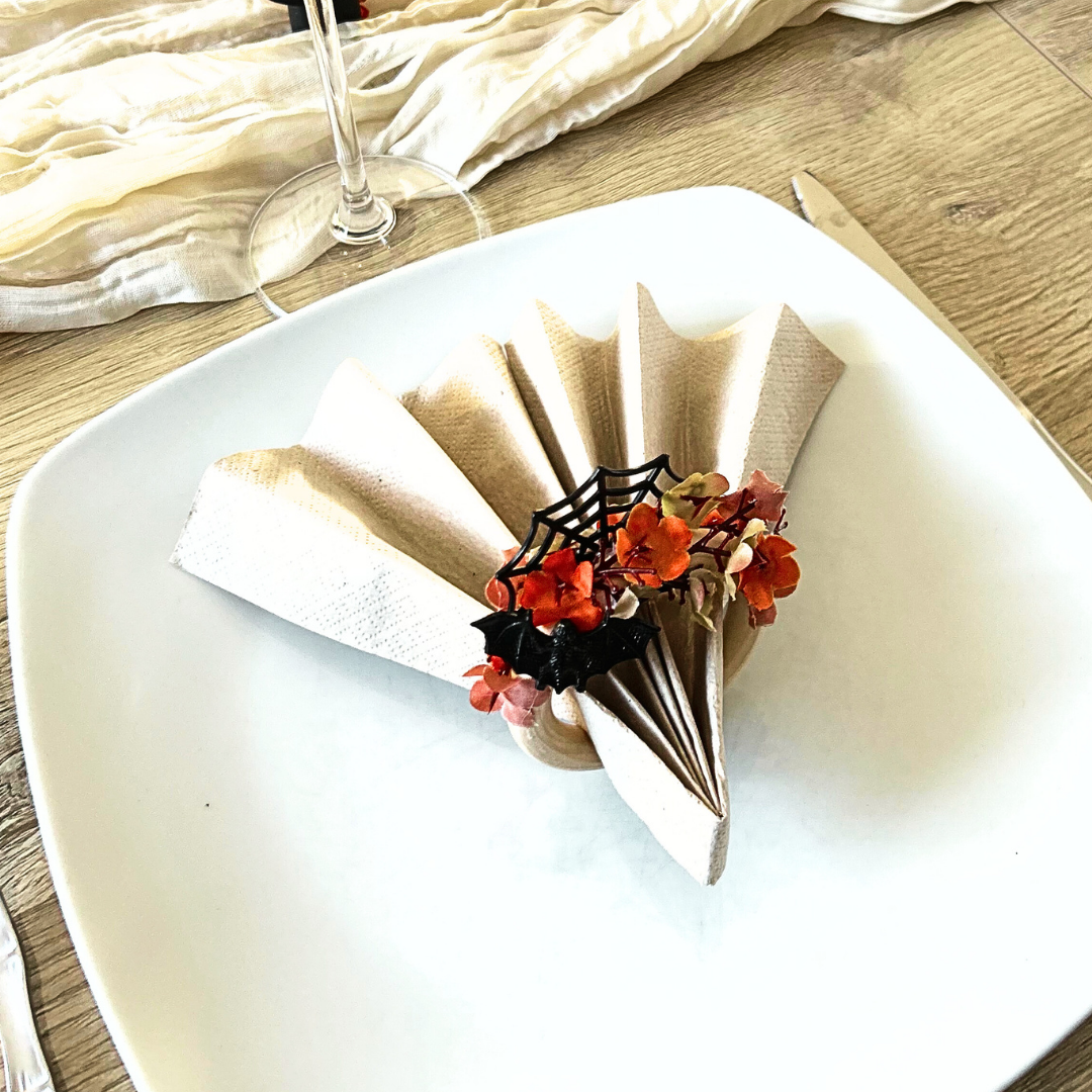 Rond de Serviette Halloween en Bois – Fleurs Artificielles, Toile d’Araignée & Chauve-Souris