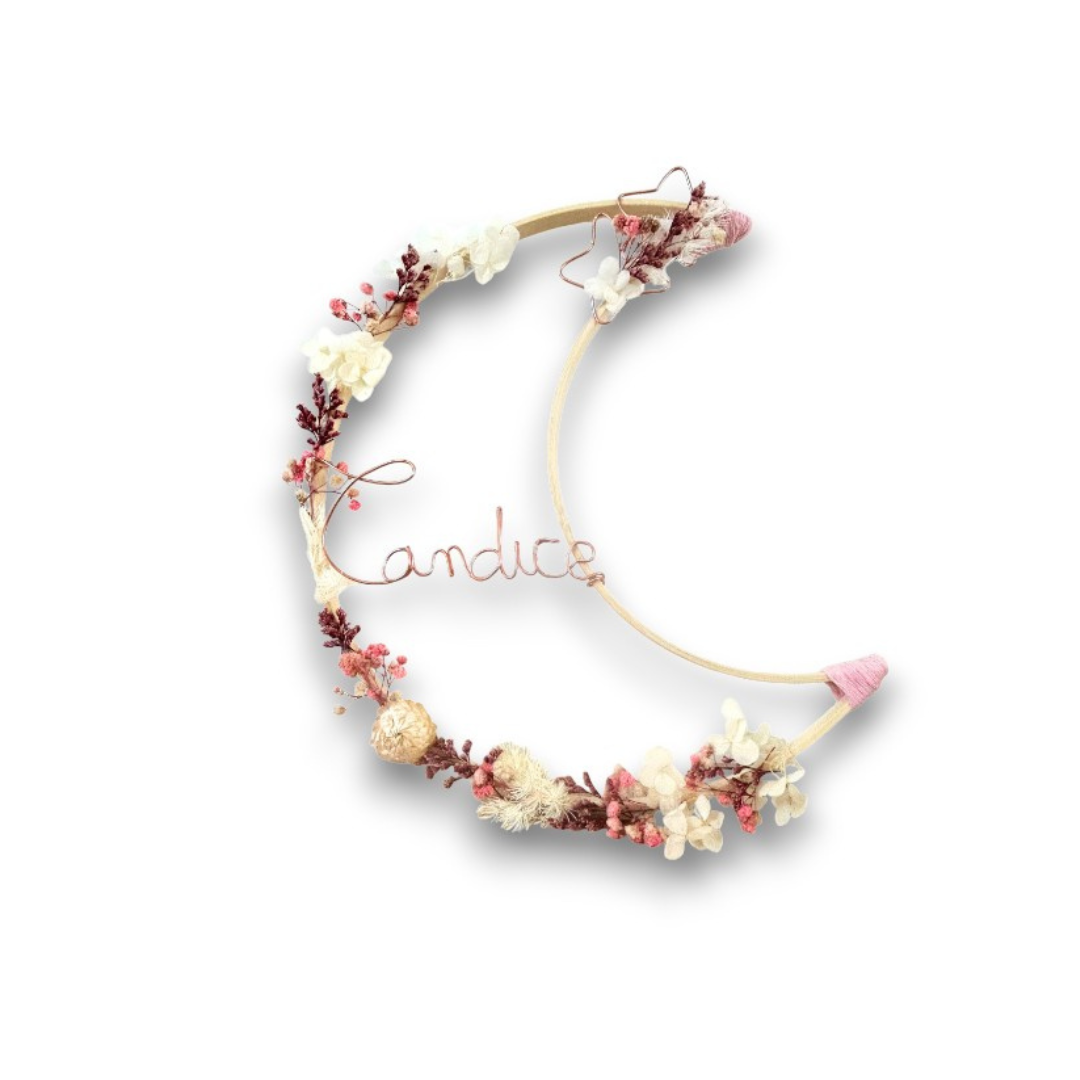 Faites plaisir à vos proches avec une création artisanale douce et poétique. Cette suspension florale en forme de lune, décorée de fleurs séchées naturelles et personnalisée avec un prénom ou un mot en fil de fer, est un cadeau intemporel qui apporte une touche bohème chic à n’importe quel intérieur.